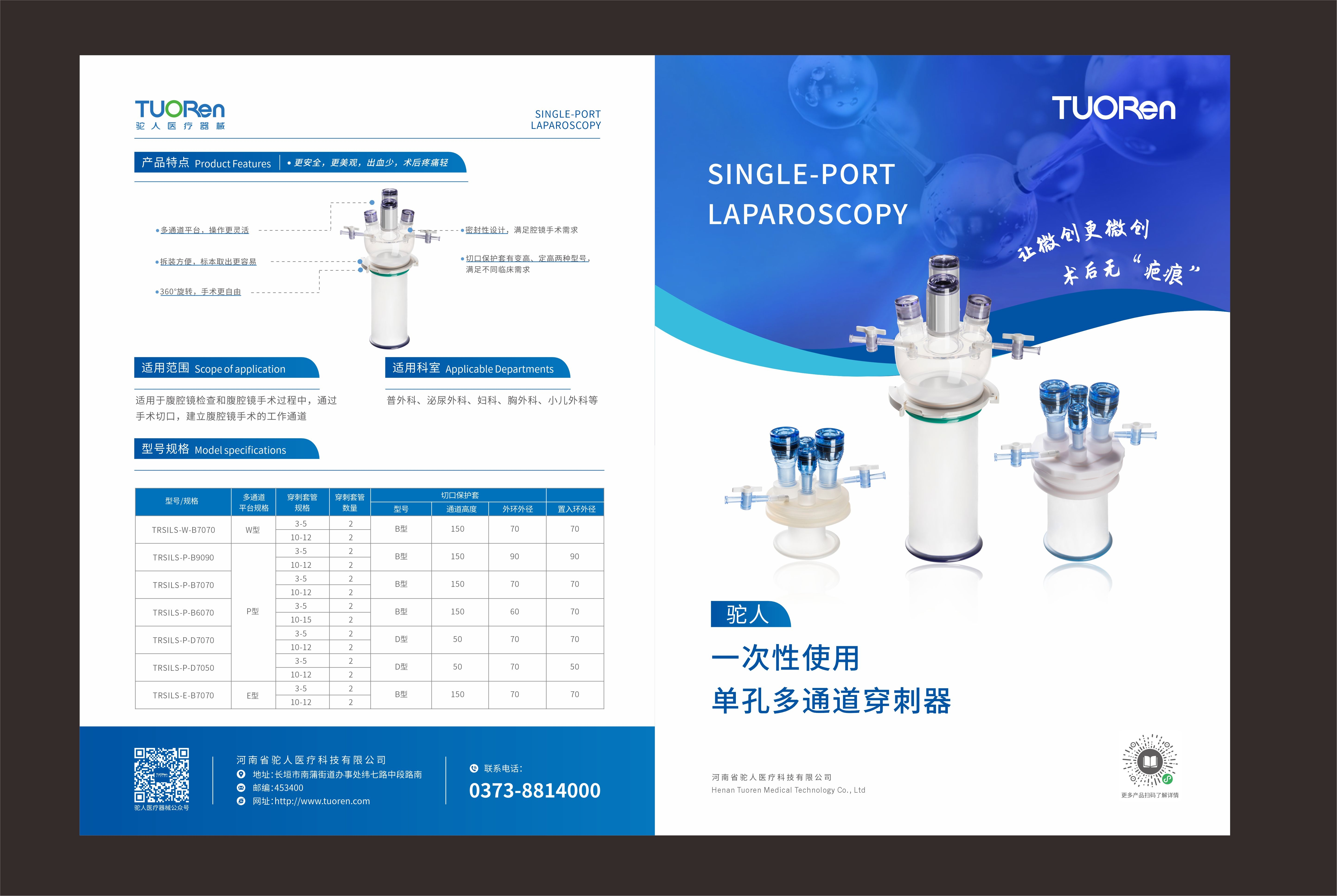 一次性使用单孔多通道穿刺器--集采替代产品 产品优势: 1、让微创更微创,术后无“疤痕”; 2、360°旋转,手术更自由; 3、拆装方便,标本取出更容易; 4、多通道平台,操作更灵活; 规格型号: TRSILS-W-B7070、TRSILS-P-B9090、TRSILS-P-B7070、TRSILS-P-B6070、TRSILS-P-D7070、TRSILS-P-D7050、TRSILS-E-B7070 适用范围: 适用于腹腔镜检查和腹腔镜手术过程中,通过手术切口,建立腹腔镜手术的工作通道。 适用科室: 普外科、泌尿外科、妇科、胸外科、小儿外科等